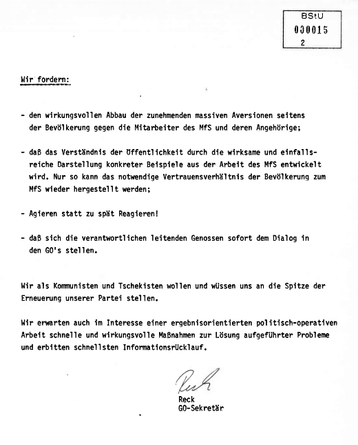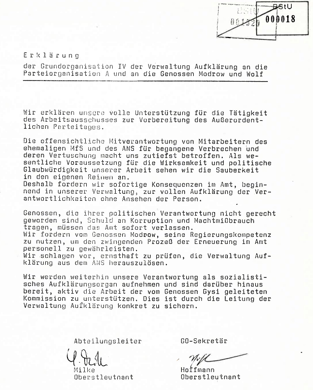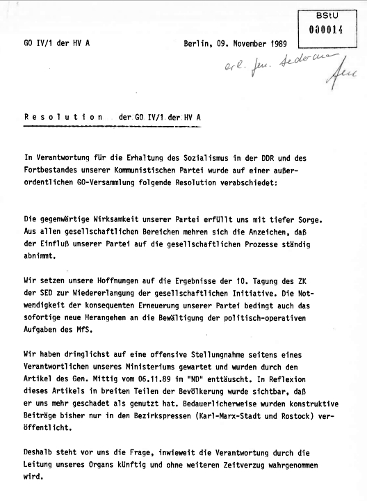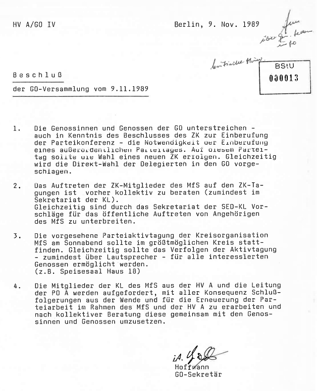Beschluß der SED-Grundorganisation HV A/IV am Nachmittag des Mauerfalls