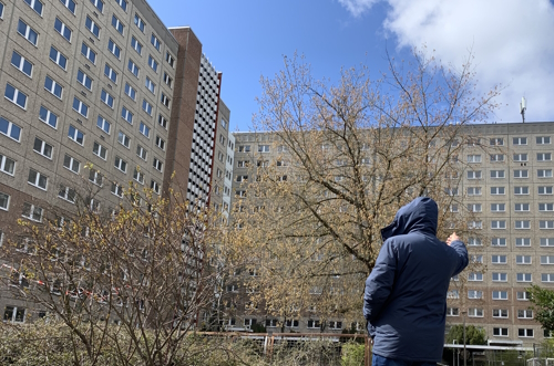Ich als Kapuzenmann vor dem früheren HV A-Gebäude